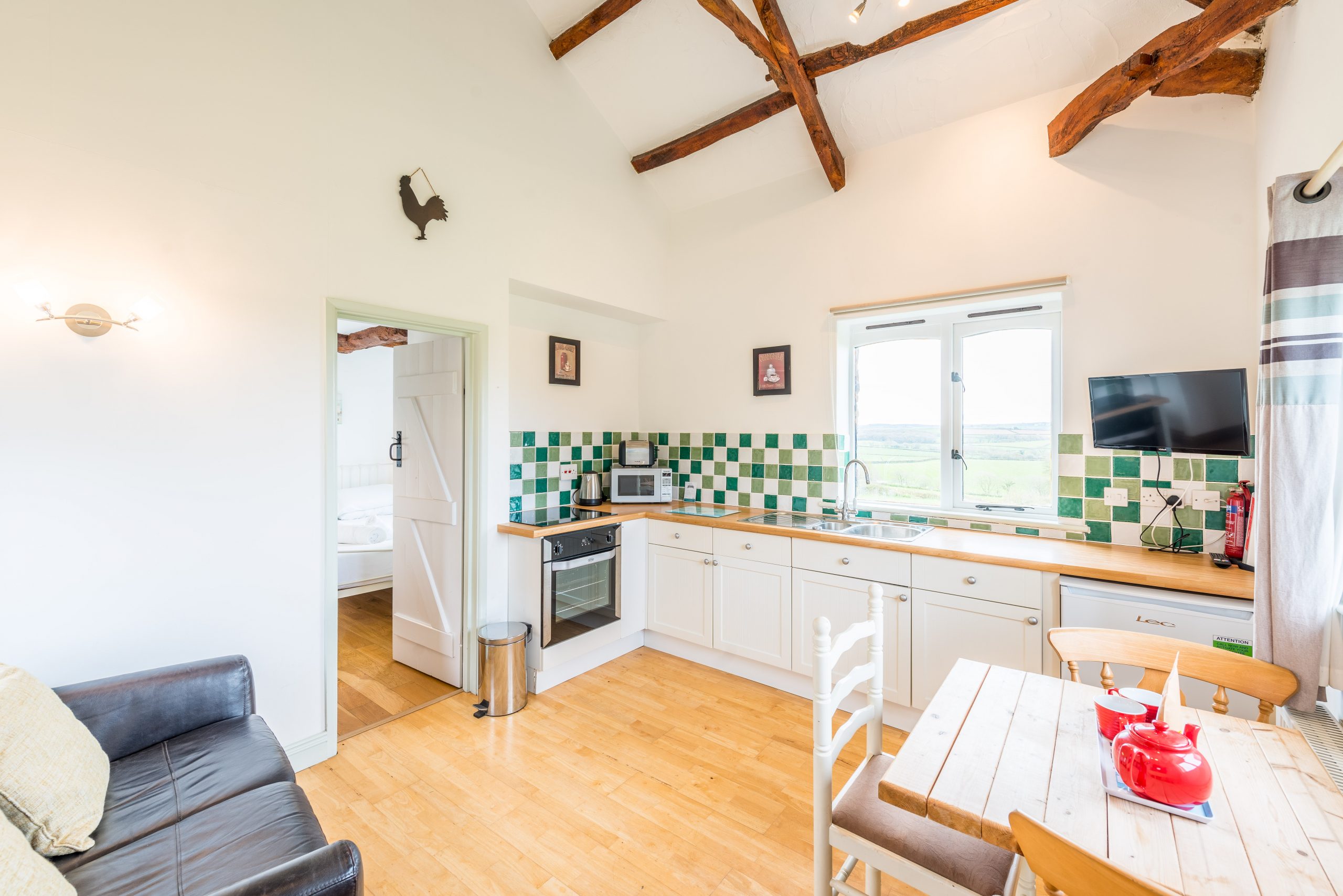 The front door opens into kitchen/living area. The well-equipped kitchen has an electric oven and hob, microwave, fridge with ice box. TV and DVD player. The living area overlooks the fields, down to the sea.